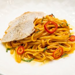 - Toss pasta with warm sauce, adding additional pasta water as needed. Plate in swirls or nests. Top with sliced chicken or 1 oz. Georgia peanuts for vegetarian option. Garnish with jalapeño slices, fresh basil, and a drizzle of olive oil.